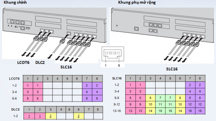 Chú ý: Mỗi cổng gồm 8 chân và chia thành từng cặp như bên dưới, đánh dấu theo mầu cho dễ, như hình dưới các bạn thấy cắp 1-1 tương ứng cho một số, tương tự 2-2; 3-3; n-n mỗi cặp cho một số máy nhánh