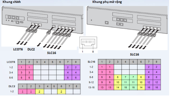 Chú ý: Mỗi cổng gồm 8 chân và chia thành từng cặp như bên dưới, đánh dấu theo mầu cho dễ, như hình dưới các bạn thấy cắp 1-1 tương ứng cho một số, tương tự 2-2; 3-3; n-n mỗi cặp cho một số máy nhánh