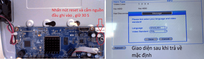 Bước 3: Nhấn nút Reset và cắm nguồn, giữ nút reset 30S sau đó thả nút ra cho đầu ghi khởi
