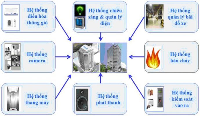 - Hệ thống quản lý tòa nhà (BMS/BAS-Building Management System/Building Automation System): Dùng trong tích hợp các hệ thống trong công trình để quản lý và giám sát trạng thái các hệ thống kỹ thuật và tự động hóa quản lý hoạt động của công trình.