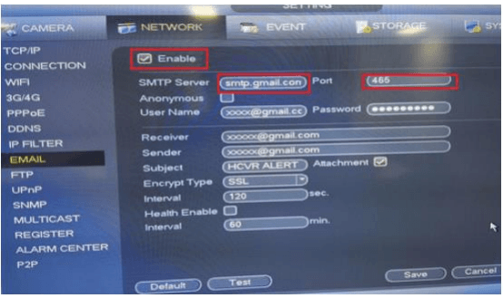 Bước 2: Check vào Enable -> Nhập địa chỉ SMTP Server và port. Trong ví dụ này là dùng SMTP Gmail của