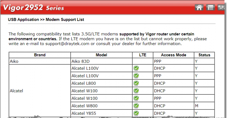DANH SÁCH USB 3G/4G/LTE tương thích với DrayTek (theo từng model)