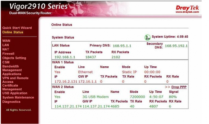 B7. Sau cùng, chúng ta mở bảng Online Status. Chúng ta có thể thấy status của WAN2 đang được kết nối. Nếu kết nối không thành công, bạn có thể tham khảo phần Troubleshooting để giải quyết 1 số trục trặc của bạn.