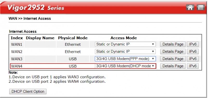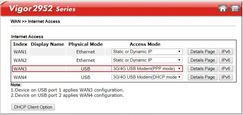 1. Vào phần WAN >> Internet Access. Chọn cơ chế 3G/4G USB modem (DHCP mode) tại phần Access Mode của USB cần cấu hình>> nhấn Details Page
