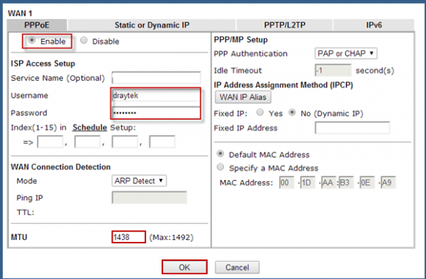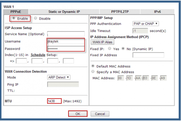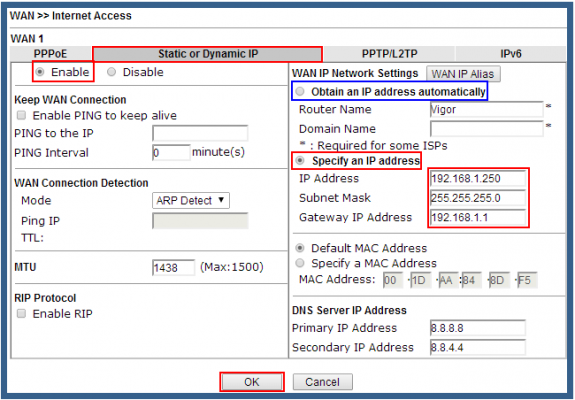 (Trong trường hợp muốn cổng WAN của Vigor2912 nhận IP động do Router đang chạy cấp, chọn Obtain an IP address automatically)