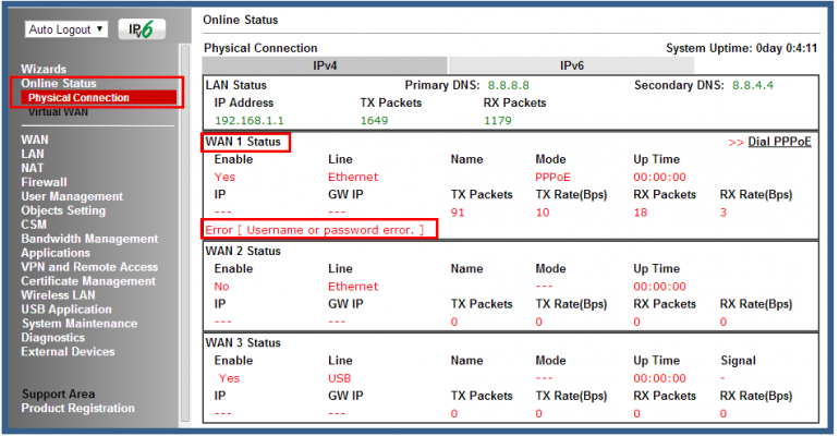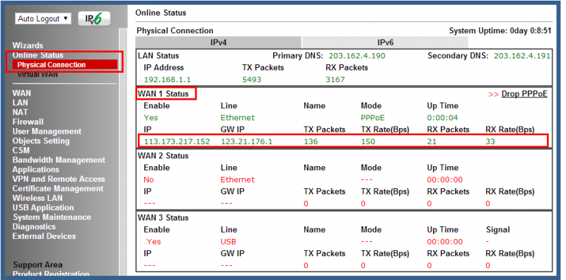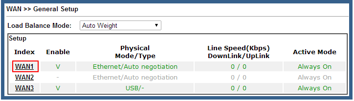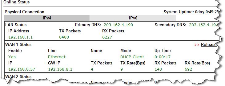 – Sau khi đăng nhập lại Vigor, vào Online Status >> Physical Connection sẽ hiện thông tin về cổng WAN1