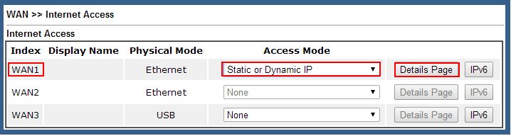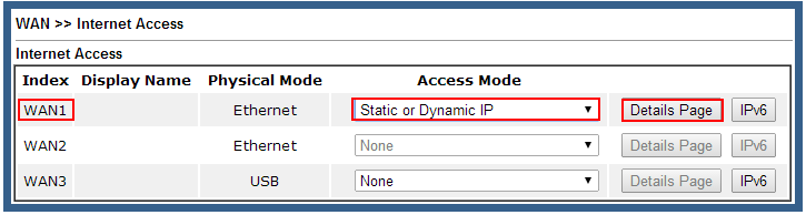 – Ở WAN 1: Chọn Access Mode là Static or Dynamic IP và nhấn Details Page