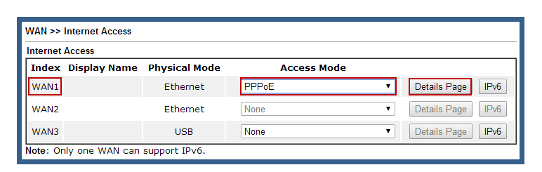 – Ở WAN 1: Chọn Access Mode là PPPoE và nhấn Details Page