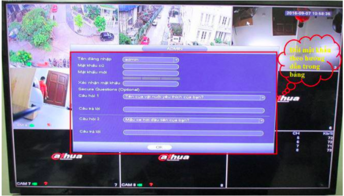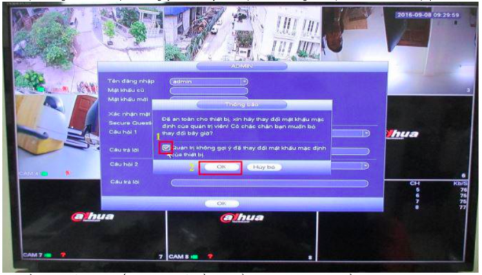 Các đầu ghi S3 của Dahua bắt buộc bạn phải đổi mật khẩu admin khác với mật khẩu mặc định là admin – admin . Nếu bạn không đổi thì sau mỗi lần đăng nhập thì bảng đổi mật khẩu sẽ hiện ra nên rất phiền phức. – Sau khi đổi mật khẩu , bảng đăng nhập sẽ hiện ra bạn chọn tên đăng nhập Admin --> (Gõ mật khẩu mới bạn vừa đổi vào) --> OK