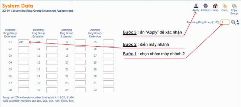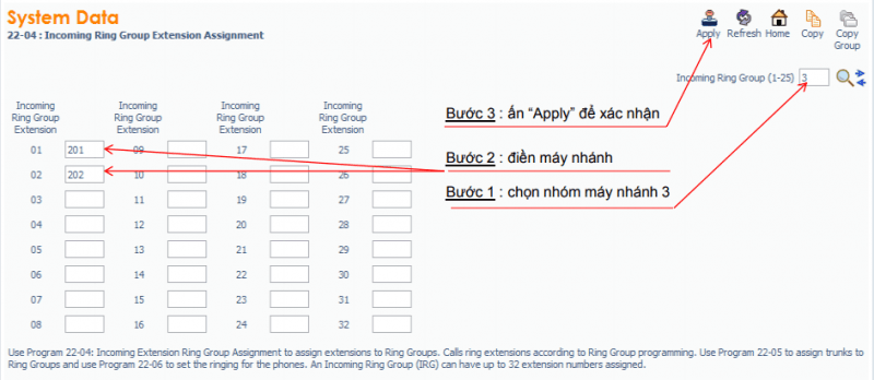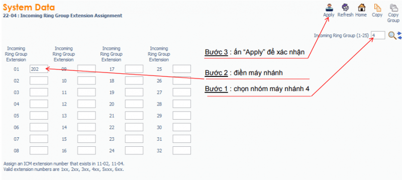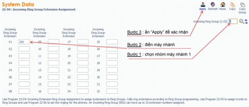– Chọn nhóm đổ chuông IRG : Lệnh 22-04, Ví dụ : IRG 3 có hai máy 201, 202