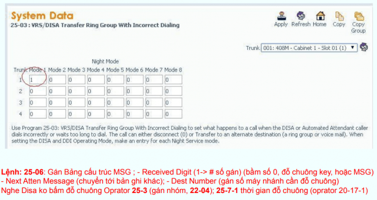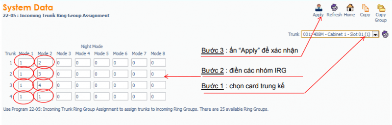 – Gắn nhóm đổ chuông IRG vào trung kế và mode thời gian : Lệnh 22-05
