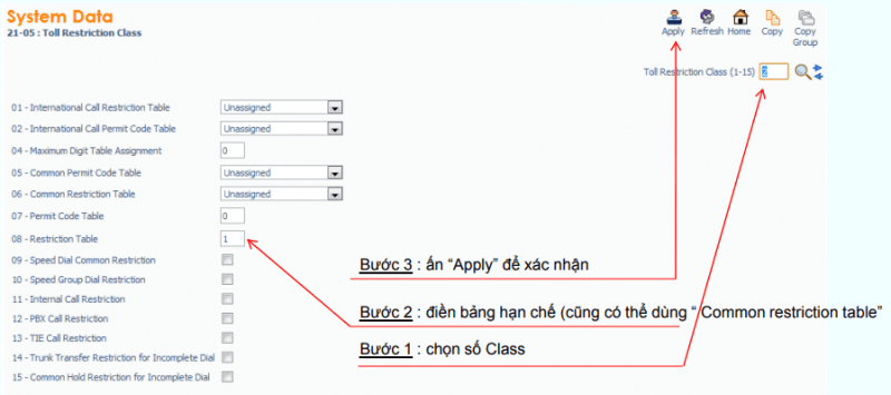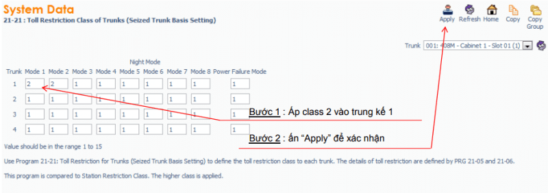 – Hạn chế gọi đường dài trên trung kế : Lệnh 21-21, Vd: Trunk 1 áp class 2