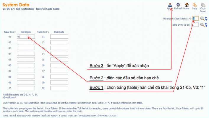– Khai báo các đầu số cần hạn chế trong bảng (table) : Lệnh 21-06-07