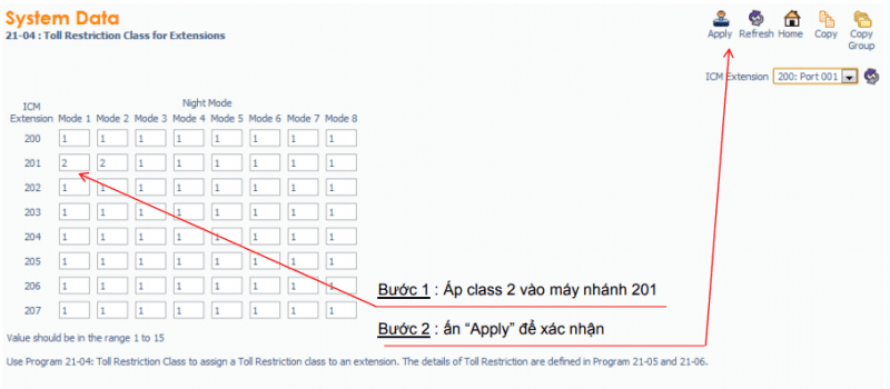 – Hạn chế gọi đường dài trên máy nhánh : Lệnh 21-04, Vd: máy 201 áp class 2