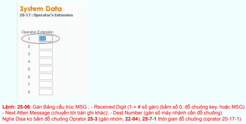 Lệnh 20-17 bấm số 0/9 đỗ chuông operator hoặc ext tương ứng