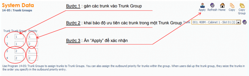 Khai báo các trunk vào các group : Lệnh PRG 14-05