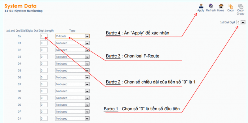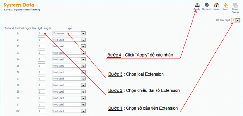 – Chọn số đầu tiên cho extension và chiều dài số tương ứng : Lệnh 11-01