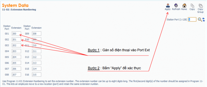 – Gán số điện thoại vào port extension tương ứng : Lệnh 11-02