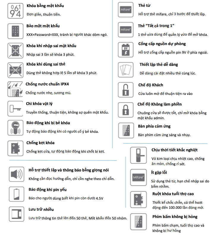 •  Bộ khóa có chức năng mật khẩu bí mật. Bạn có thể nhập mật khẩu với các số ngẫu nhiên. Ví dụ: