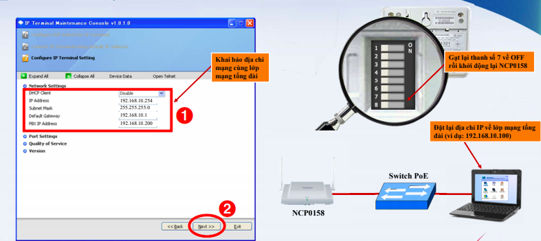 Bước 1: Kết nối NCP0158 và PC vào switch (Hoặc kết nối trực tiếp không qua switch).