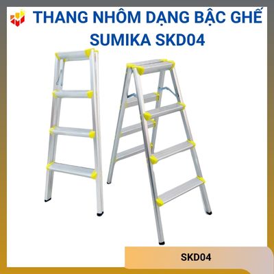 - Thang nhôm Sumika SKD04 được sản xuất từ nhôm bền bỉ, có khả năng chịu tải lên đến 100kg, phù hợp với nhiều đối tượng người dùng. Với thiết kế mỗi bên có 4 bậc, khoảng cách giữa các bậc là 25cm, thoải mái leo trèo khi làm việc.