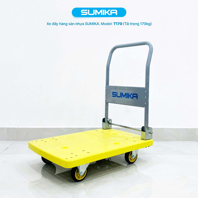 - Với sàn nhựa PP siêu chắc chắn có độ bền cao, Sumika T170 không bị biến dạng khi va đập mạnh và có thể chịu được tải trọng lên đến 170kg. Tay cầm của xe có độ cao phù hợp với người Việt Nam nên người dùng không phải cúi khom người khi đẩy (người cao 1m4 – 1m8 đều có thể dùng được), không gây đau lưng khi sử dụng lâu dài.