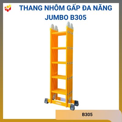 - Thang nhôm gấp đa năng Jumbo B305 được thiết kế chiam làm 4 đoạn, mỗi đoạn gồm 5 bậc và chuyển đổi được thành nhiều dáng thang khác nhau như: A, L, U, M, I… phù hợp với mọi yêu cầu công việc trên cao.