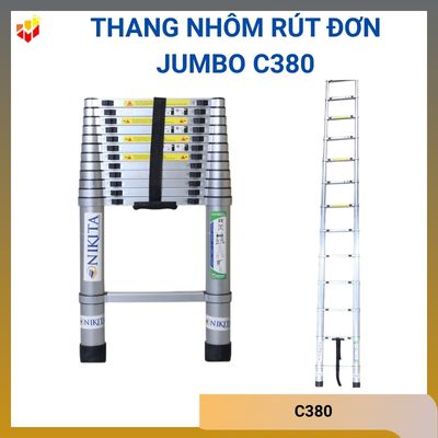 - Thang nhôm rút đơn Jumbo C380 là dòng thang rút sử dụng ở dạng duỗi thẳng chữ I với chiều cao tối đa 3.8m. Thang nhôm thiết kế rất khoa học, các bậc thang có thể tùy chỉnh kéo lên/hạ xuống tùy theo mục đích sử dụng ở độ cao khác nhau, mang đến sự thuận tiện cho người sử dụng.