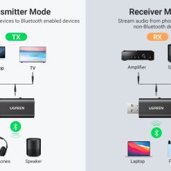 Bộ thu/ phát Bluetooth 5.1 UGREEN 60300 – 2 chế độ TX và RX - Lưu ý: Cuộc gọi điện thoại chỉ được hỗ trợ ở chế độ RX, không được hỗ trợ ở chế độ TX